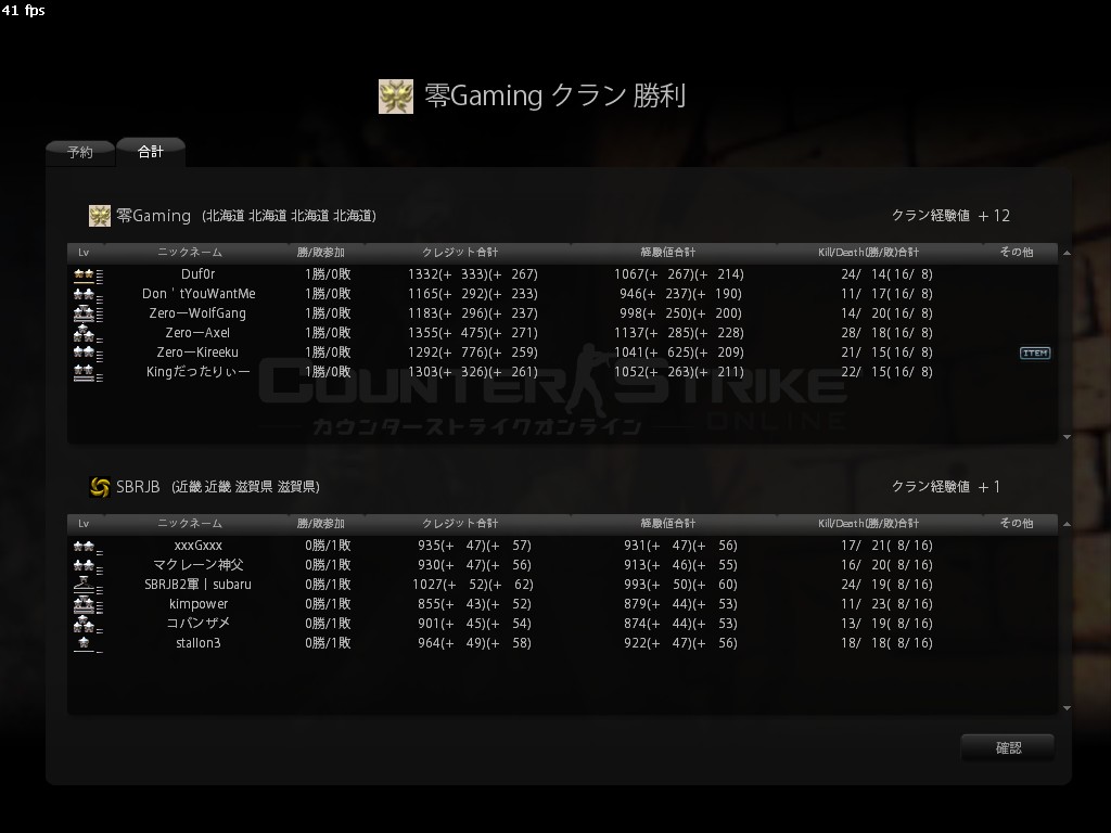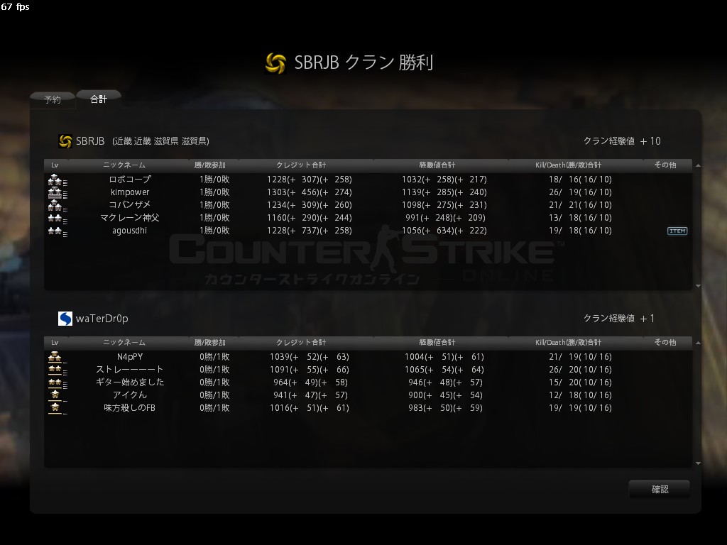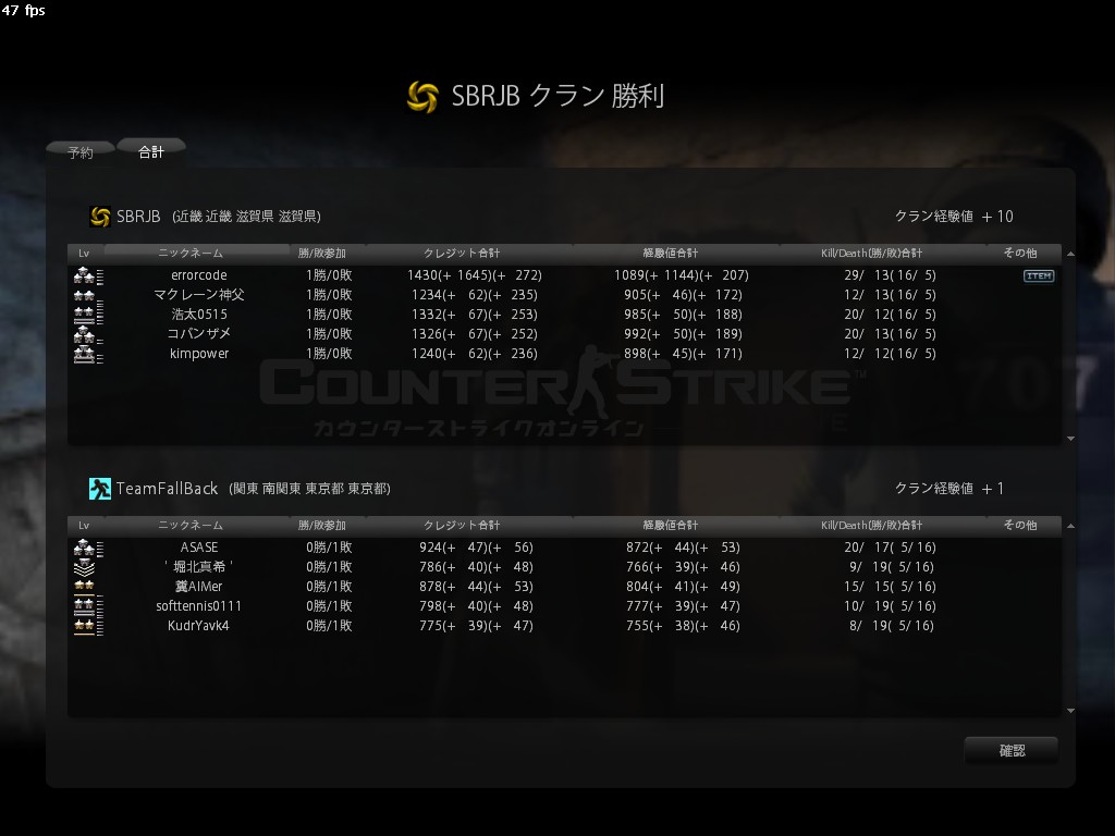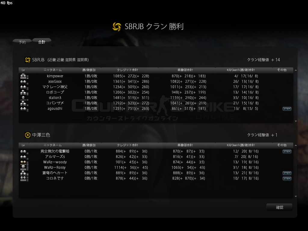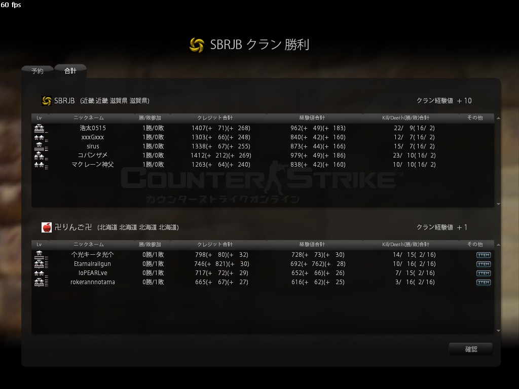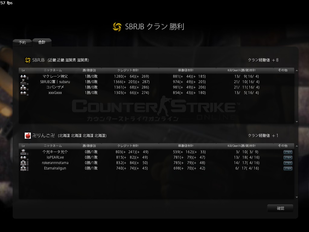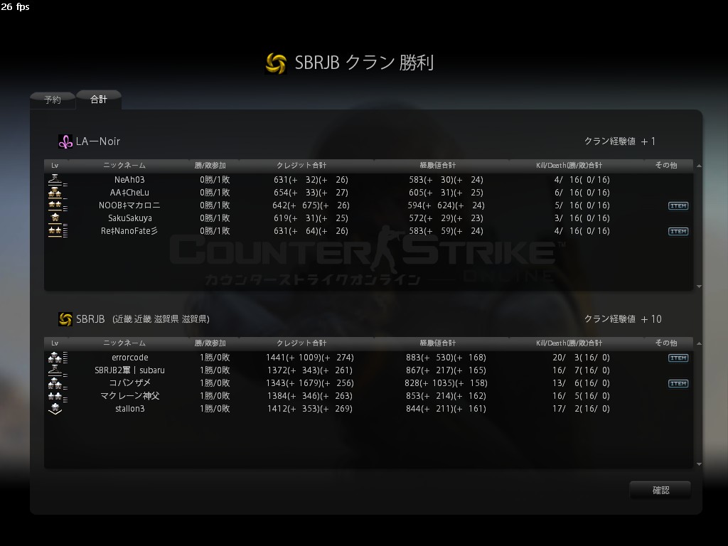 1試合目です。力負けですね>< vs TeamFallBackさん TRがラウンドが取れたので後半はあせらずにできました。 2試合ありがとうございましたm(__)m vs Chipmunksさん 当たって砕けろでした! vs 4LDKさん 久しぶりの6-6、楽しかったです。 |